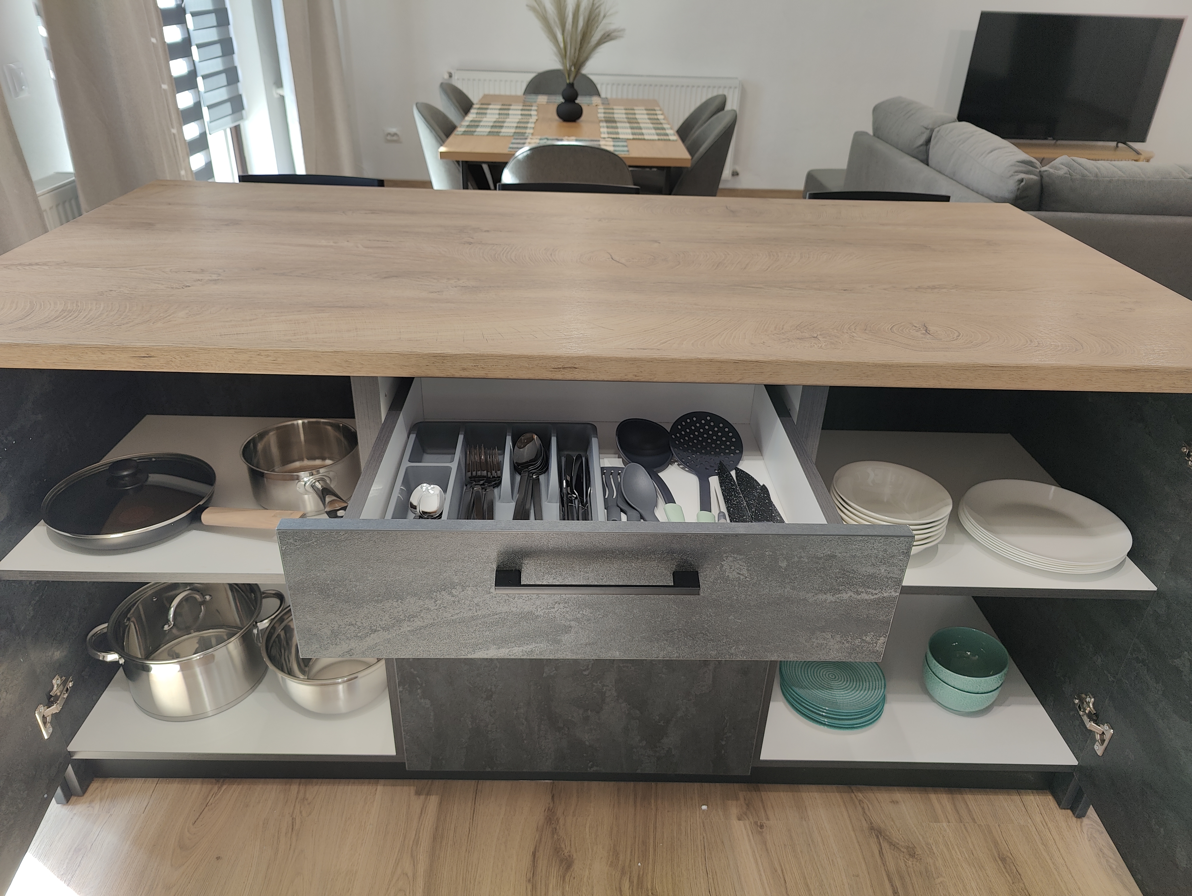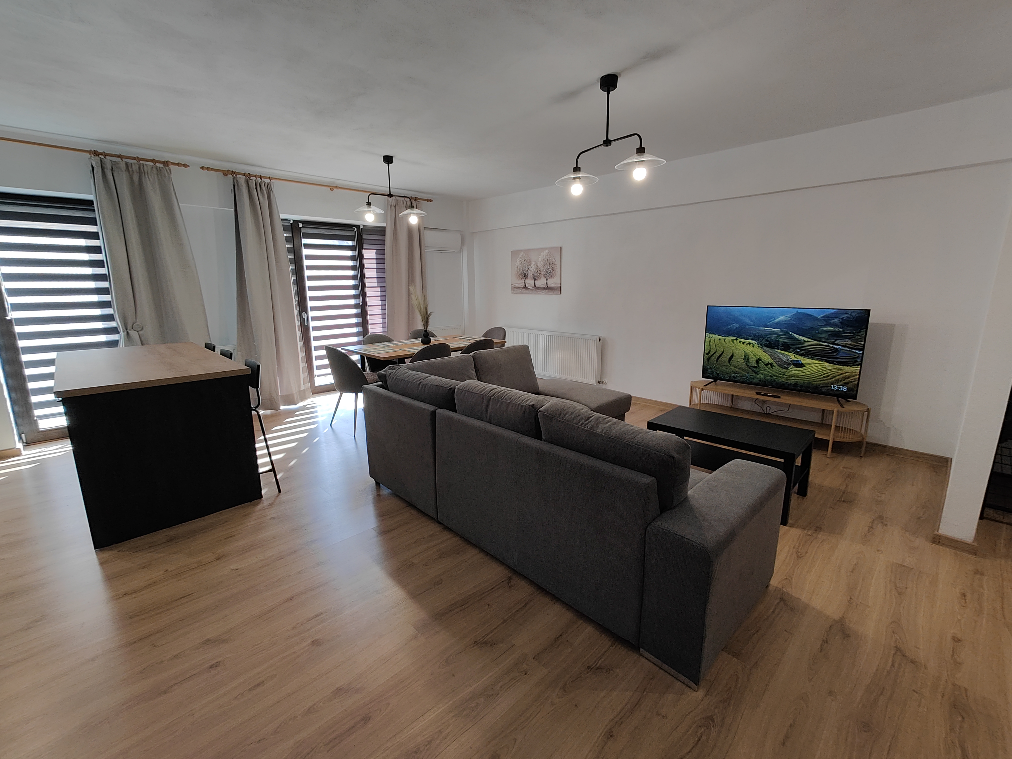 Fiecare apartament este spațios, luminos și amenajat modern, fiind gândit pentru a oferi o experiență plăcută și relaxantă. Apartamentele sunt compuse din două dormitoare confortabile, două băi și o zonă de living generoasă cu o canapea extensibilă, perfectă pentru relaxare după o zi petrecută în oraș. Apartamentul poate găzdui până la 6 persoane adulte. Spațiul de zi include și o bucătărie open space spațioasă, complet integrată în zona de living, creând un ambient modern și primitor, ideal pentru familii sau grupuri mici.
